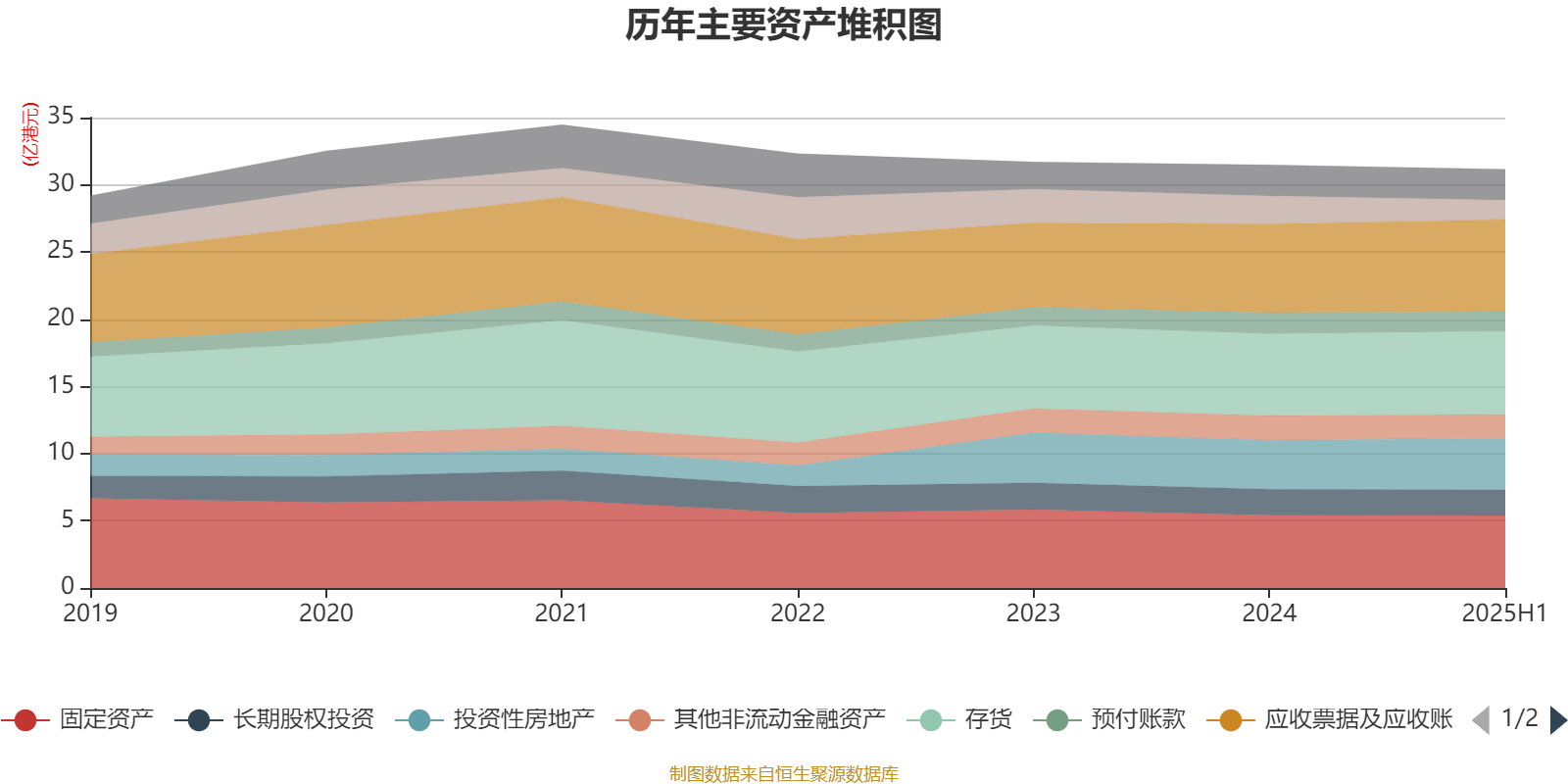 资产重大变化方面,截至2025年上半年,公司货币资金较上期末减少30.93%,占公司总资产比重下降2个百分点;应收票据及应收账款较上期末增加3.89%,占公司总资产比重上升1.04个百分点;投资性房地产较上期末增加4.71%,占公司总资产比重上升0.67个百分点;存货较上期末增加1.68%,占公司总资产比重上升0.53个百分点。